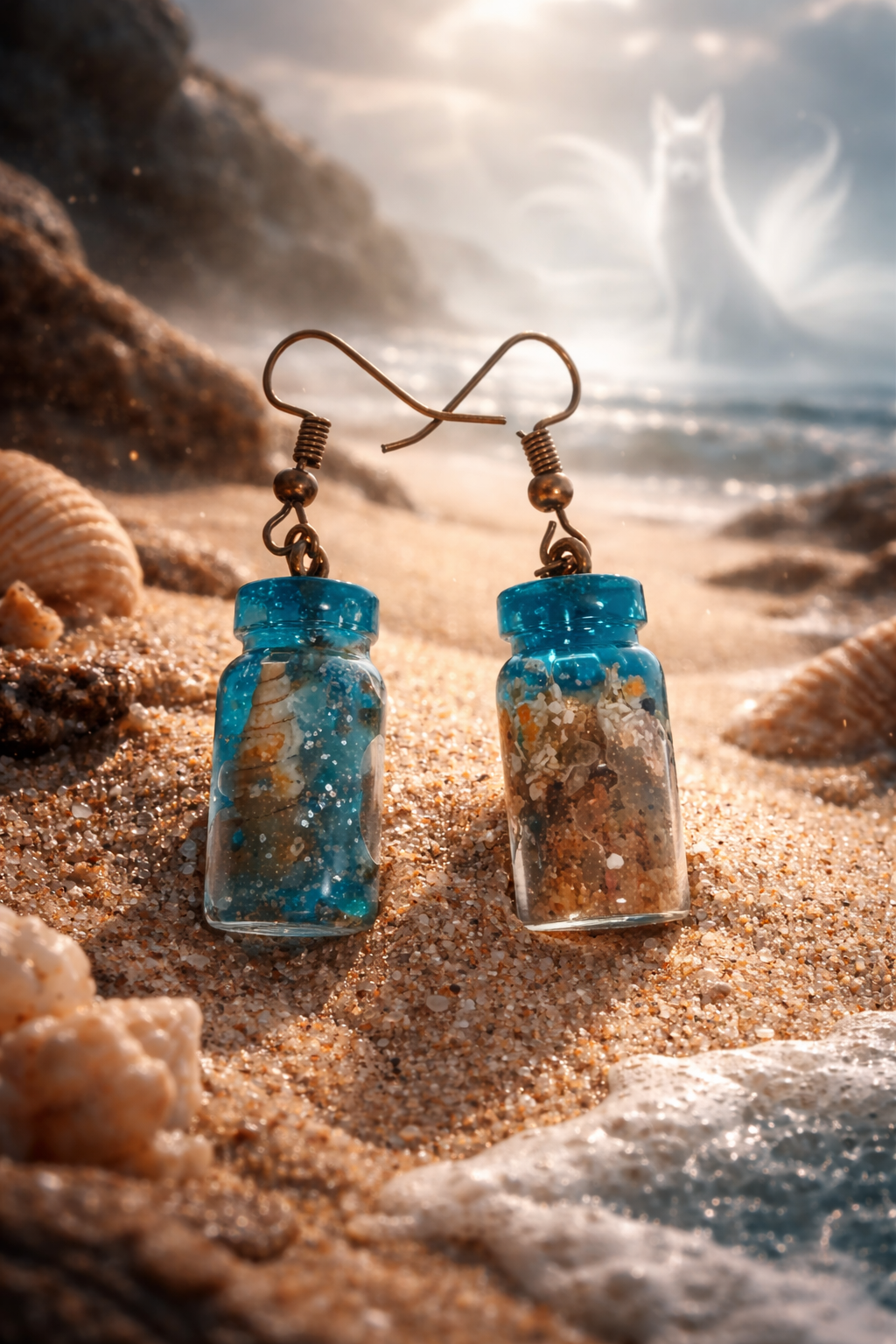 Each pair of Ocean Relic Resin Bottle Earrings captures a fragment of the shoreline, sealed inside crystal-clear resin like a message in a bottle. Sand, shells, and sea textures rest inside miniature glass-like vials, suspended forever in a glossy finish that catches light like sunlight dancing on water.